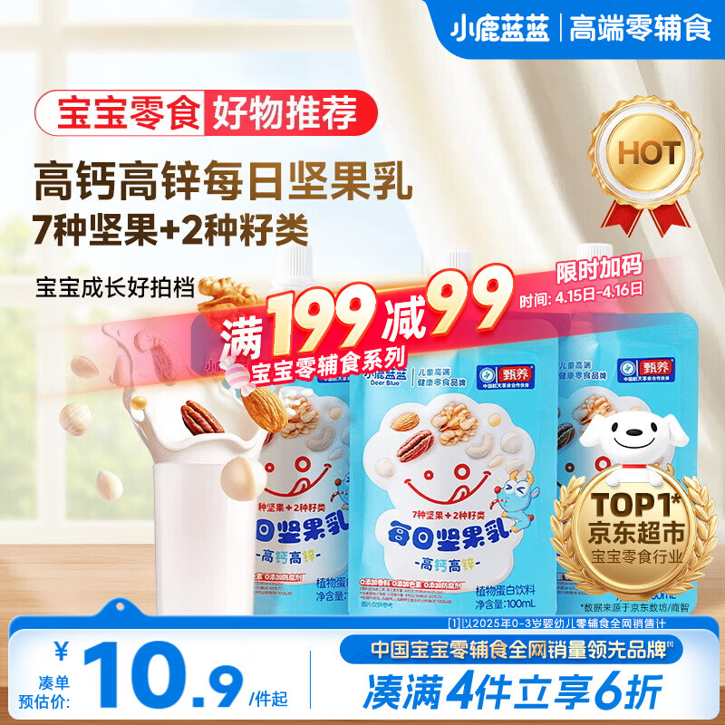 小鹿蓝蓝高钙高锌每日坚果乳饮品100ml*3袋儿童饮料健康零食植物蛋白3岁+