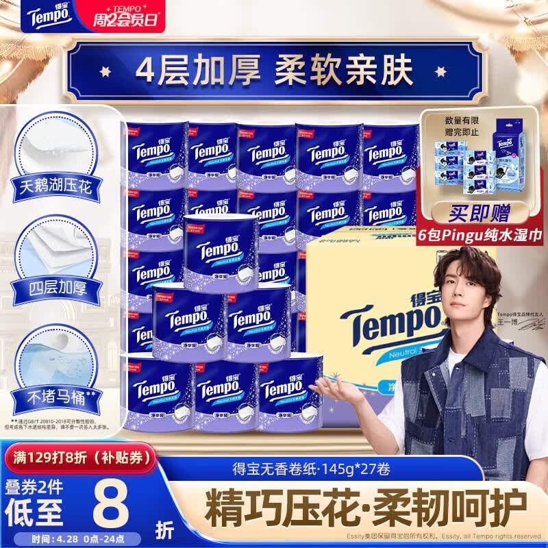 得宝(TEMPO)一博同款 有芯卷纸 无香4层145g*27卷 可冲散 卫生纸 卷筒纸