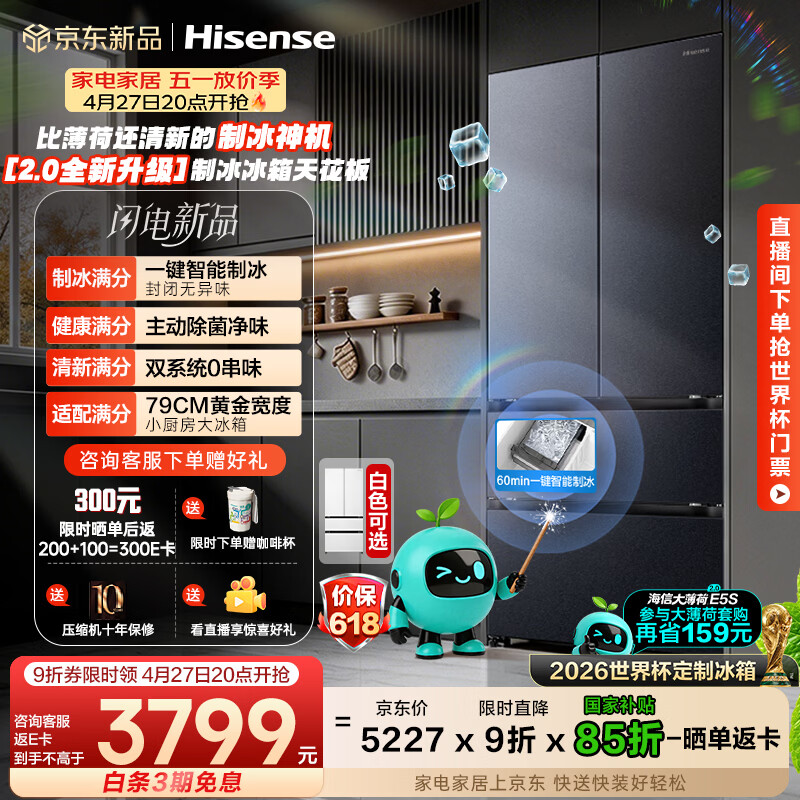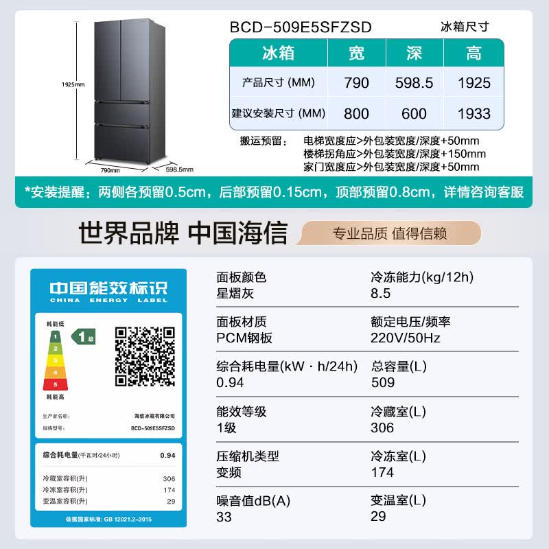 海信大薄荷2.0 509L法式多门冰箱双系统自动制冰超薄超窄零嵌入大容量净味BCD-509E5SFZSD灰国家补贴